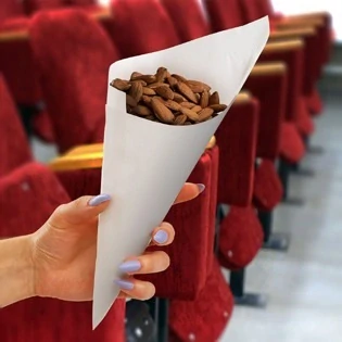 Praktické papírové kornouty bez potisku v přírodně bílé barvě vhodné na oříšky, čokoládu, nebo sušené ovoce o hmotnosti cca 250 g.